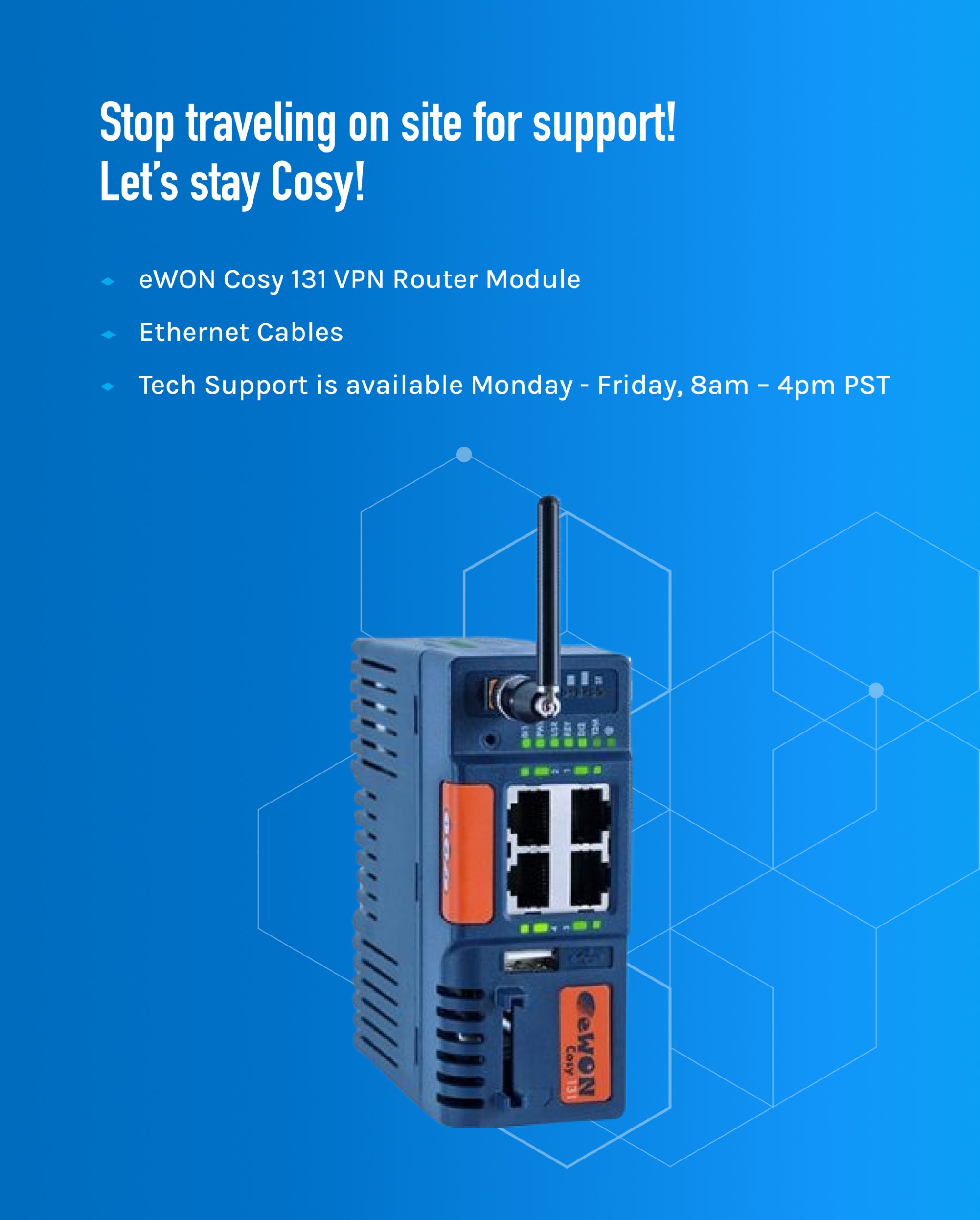 Adding an eWON Cosy 131 offers remote machine access and allows Columbia Service Techs or your maintenance technicians to interact with the control system of your palletizer or conveyor system. eWON is a cloud-based service that provides a secure virtual private network (VPN) access to your automation system. Utilizing the eWON industrial VPN router, you can monitor or collect machine data as if you were connected directly to the machine. It allows remote access to help resolve machine issues quickly, saves thousands of dollars by avoiding costly service visits, increases valuable uptime, and reduces labor costs.